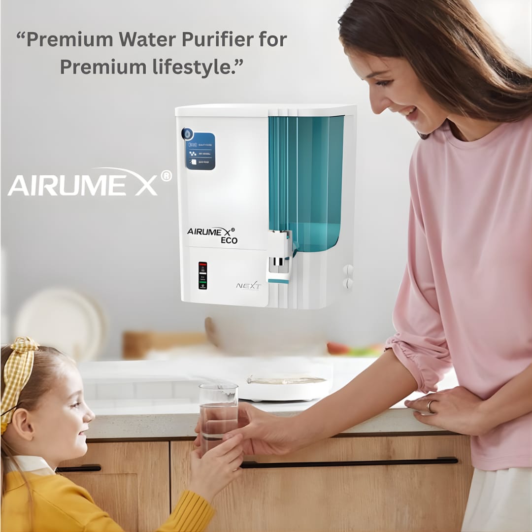 Embrace eco-friendly purity with the AIRUMEX ECO, a compact 10L storage water purifier that revitalizes your water with vital minerals. Its robust 7-stage purification—Reverse Osmosis (RO), Mineral (MIN) addition, Ultra Violet (UV) sterilization, Ultrafiltration (UF), TDS Controller, Sediment, Carbon, and Spun filters—guarantees fresh, impurity-free hydration. Constructed from 100% food-grade plastic in classic Black or White, this lightweight 5KG marvel (40cm H x 30cm W) adapts effortlessly to wall-mount or tabletop placement with a safe 24V electrical setup.